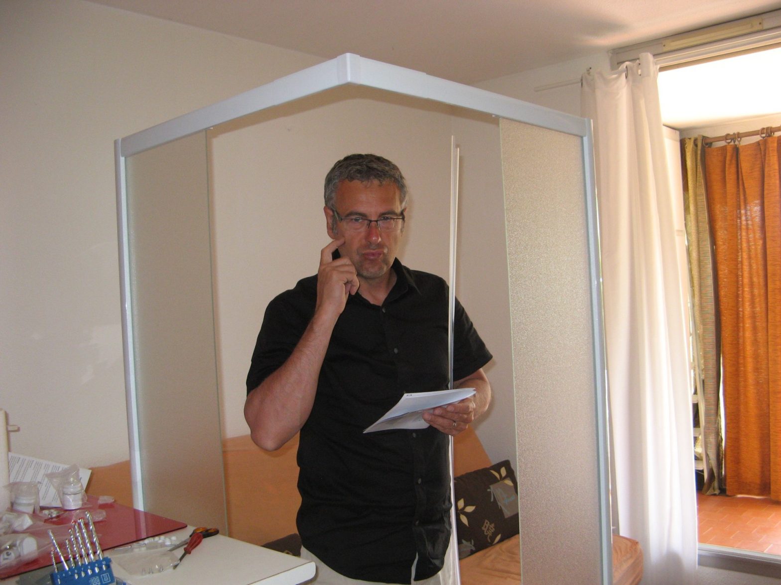 On attend JP qui doit arriver de St-Tropez. Il arrive alors on s’active. Pas très compliqué, ça ressemble à un kit IKEA. Je retire la vieille, j’assemble le kit, Jean-Pierre prépare la surface, on monte le tout, scellant, et voilà, terminé, 3 heures plus tard.